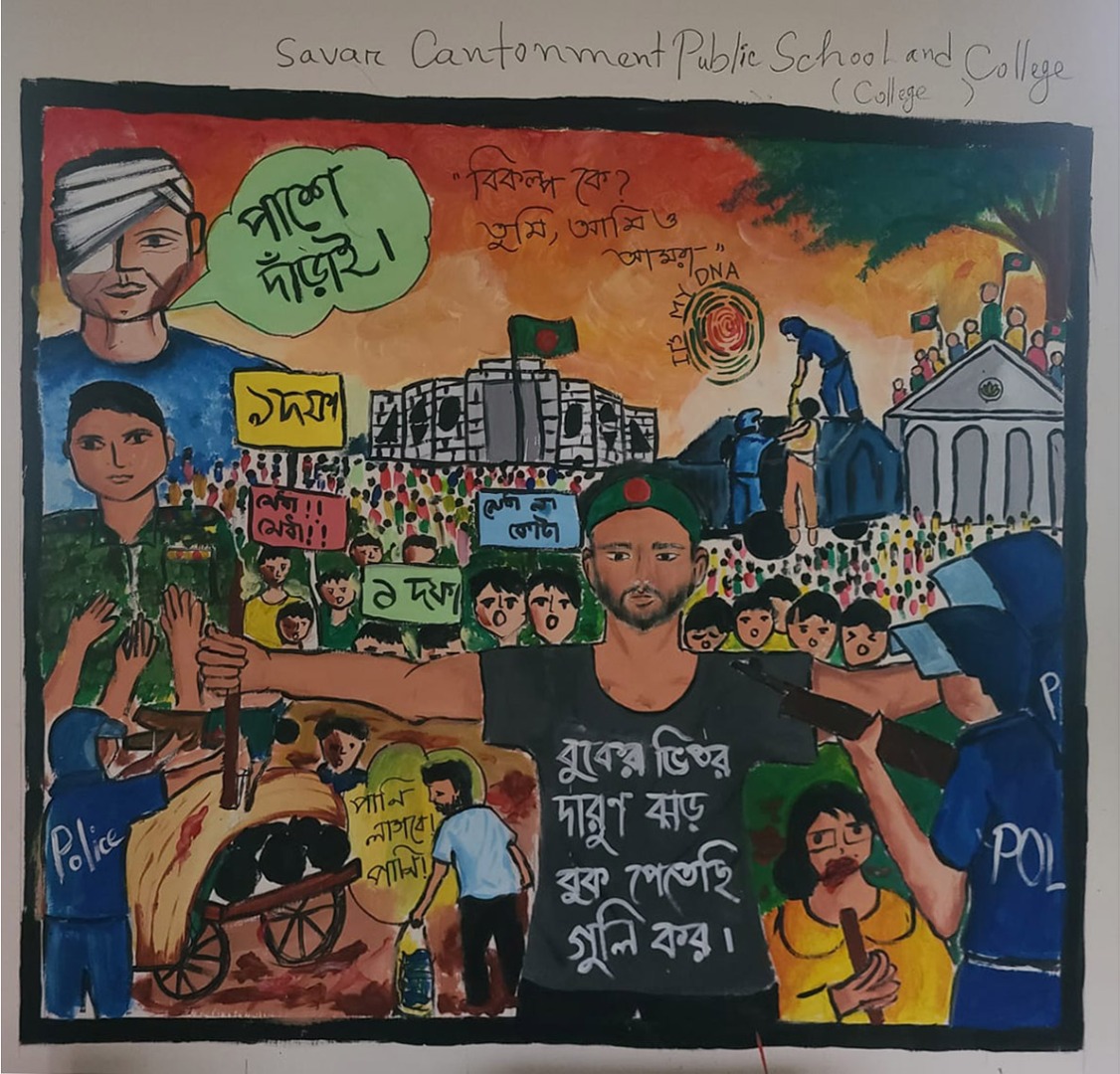 জুলাই গণভ্যুত্থান বর্ষপূর্তি পালন উপলক্ষে আয়োজিত “২৪ এর রঙে গ্রাফিতি ও চিত্রাংকন” এর স্থিরচিত্র সাভার ক্যান্টনম্যান্টে পাবলিক স্কুল এন্ড কলেজ |