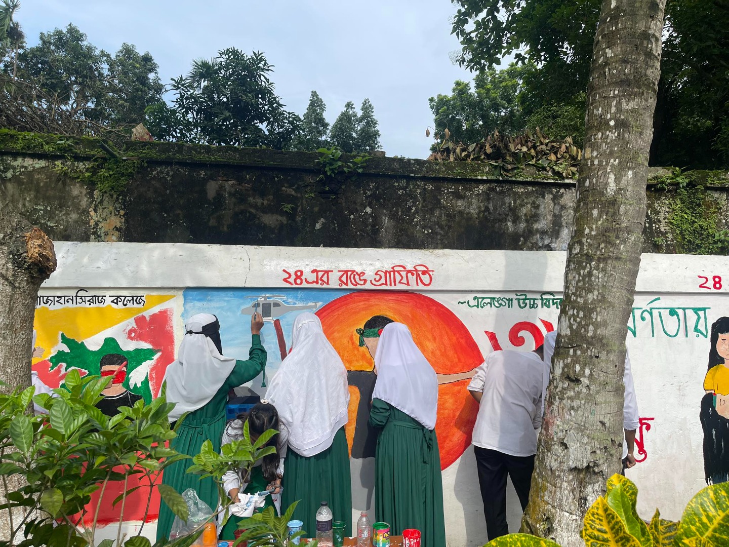 জুলাই গণভ্যুত্থান বর্ষপূর্তি পালন উপলক্ষে আয়োজিত “২৪ এর রঙে গ্রাফিতি ও চিত্রাংকন” এর স্থিরচিত্র রাগীব রাবেয়া উচ্চ বিদ্যালয় ,হবিগঞ্জ |