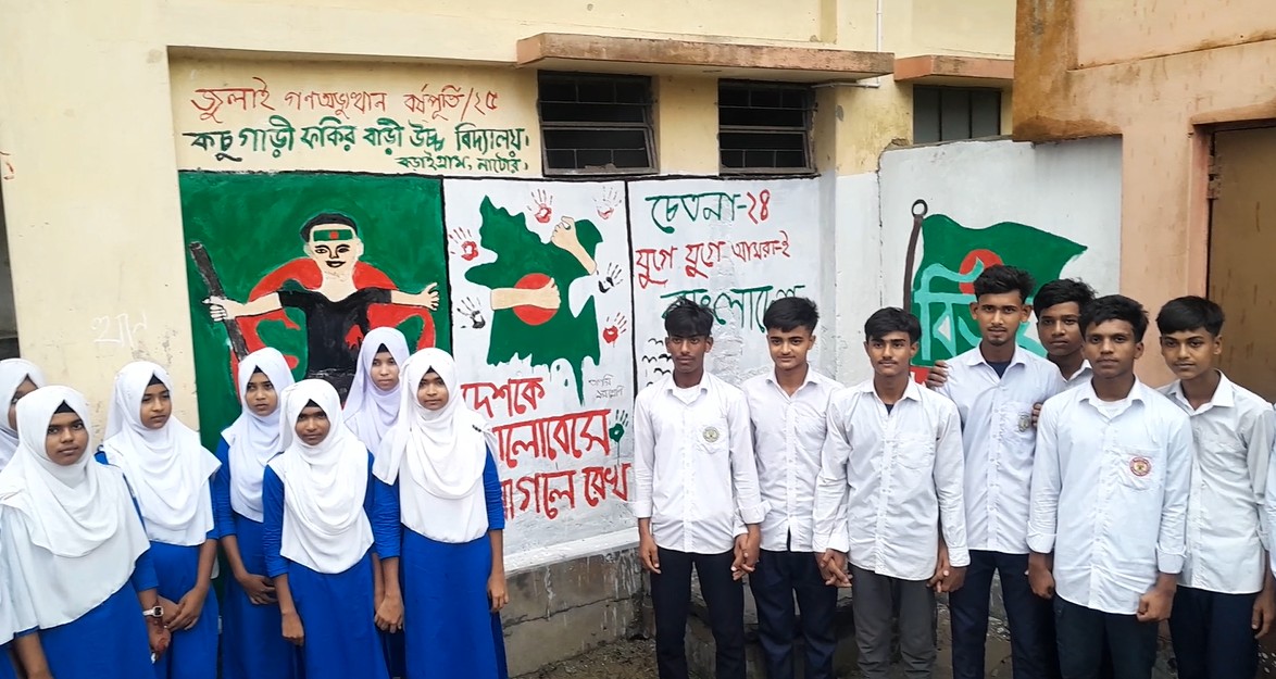 জুলাই গণভ্যুত্থান বর্ষপূর্তি পালন উপলক্ষে আয়োজিত “২৪ এর রঙে গ্রাফিতি ও চিত্রাংকন” এর স্থিরচিত্র কচুগাড়ী ফকির বাড়ী উচ্চ বিদ্যালয়, কড়াইগ্রাম, নাটোর |