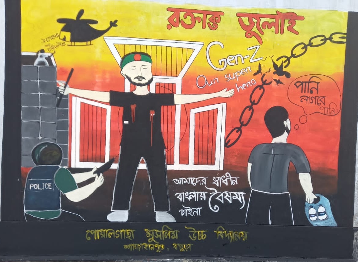 জুলাই গণভ্যুত্থান বর্ষপূর্তি পালন উপলক্ষে আয়োজিত “২৪ এর রঙে গ্রাফিতি ও চিত্রাংকন” এর স্থিরচিত্র পোয়াল গাছা মুসলিম উচ্চ বিদ্যালয় শাজাহানপুর, বগুড়া |
