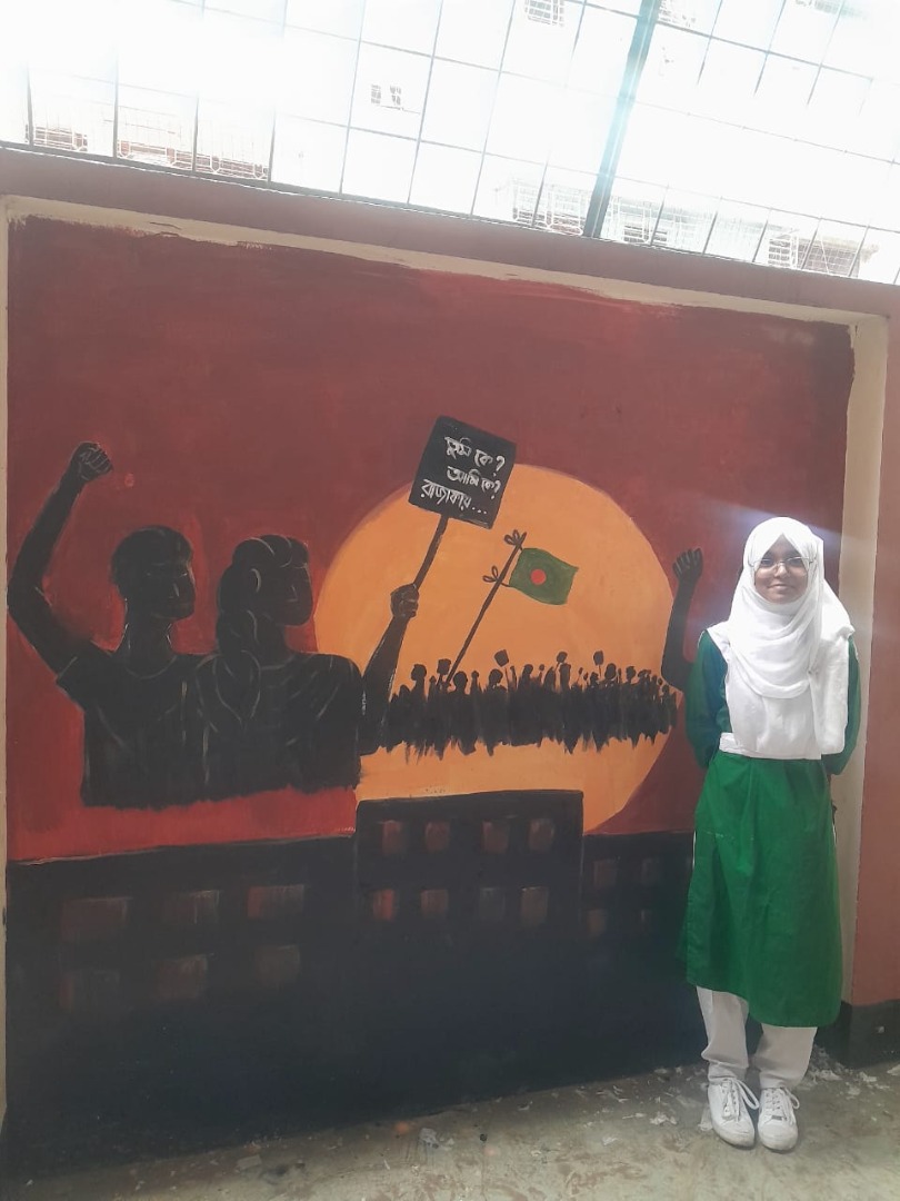 জুলাই গণভ্যুত্থান বর্ষপূর্তি পালন উপলক্ষে আয়োজিত “২৪ এর রঙে গ্রাফিতি ও চিত্রাংকন” এর স্থিরচিত্র খালেদ হাইদার মেমোরিয়াল জুনিয়র গার্লস হাই স্কুল |